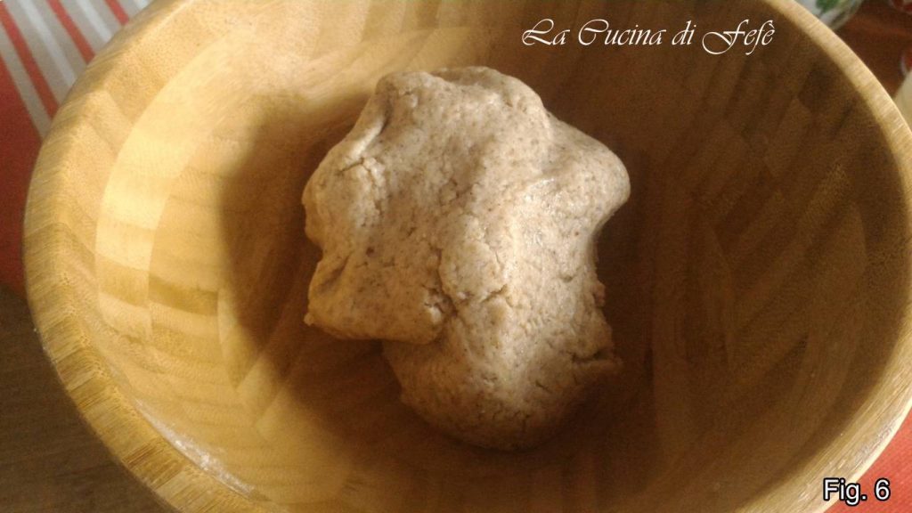 Roer met een lepel en giet uiteindelijk beetje bij beetje de hazelnootmelk erbij (fig. 4). Begin direct in de kom alle ingrediënten te kneden (fig. 5).