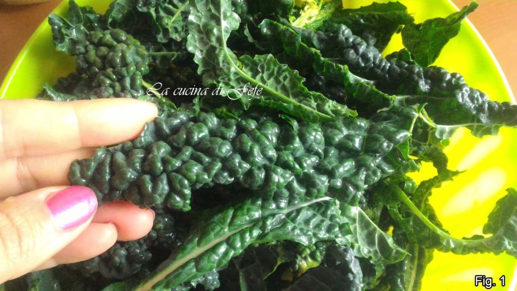 Was en snijd de bladeren van boerenkool, snijd ze in reepjes en verwijder de hardere middenrib (fig. 1).