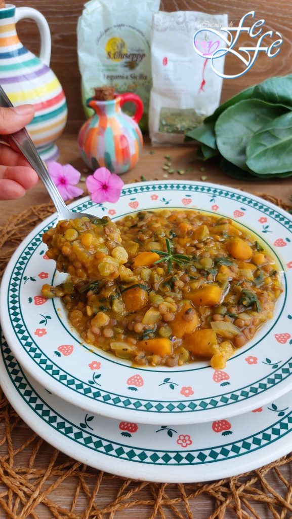 Met de komst van het herfstseizoen worden de tafels verrijkt met troostrijke, warme en rijke gerechten vol seizoensgroenten en peulvruchten. Soepen, minestrones en crèmes zijn mijn favoriete sfeer, zoveel dat ik voortdurend varieer op alle mogelijke combinaties om altijd authentieke en gezonde gerechten te creëren die echter nooit teleurstellen! Dat is het geval met deze heerlijk omhullende soep, een beetje per ongeluk gemaakt met wat ik eigenlijk in de koelkast had en die ik, om het met jullie te delen, een tweede keer moest maken. Ik zou zeggen dat het eigenlijk een aangename opoffering was! En ik zal je vertellen, deze was zelfs beter dan de eerste, dankzij de toevoeging net voor het serveren van een geheime ingrediënt, dat de hele zaak een extra boost geeft! Deze soep is op basis van twee soorten peulvruchten, linzen en gedroogde groene erwten, een bron van vitamines en mineralen naast plantaardige eiwitten. De keuze voor de mantovaanse pompoen is niet toevallig, omdat het een volle notenachtige geur kan geven die ik heel erg lekker vind, en de zoete combinatie met snijbieten is absoluut winnend! Ik raad je aan om het te serveren tijdens de koude winter- of herfstmaanden, want het verwarmt lichaam en geest! Probeer het met plakjes zelfgebakken brood of met rozemarijncroutons, je zult ervan genieten!