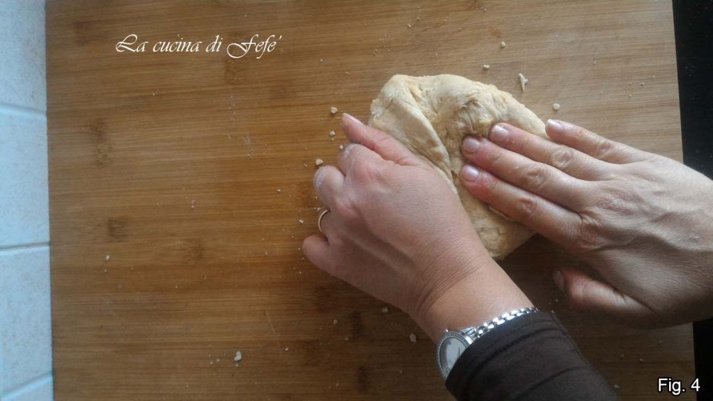 Verplaats het deeg vervolgens op een werkvlak met al het resterende meel en kneed het 10′ krachtig (fig. 4).