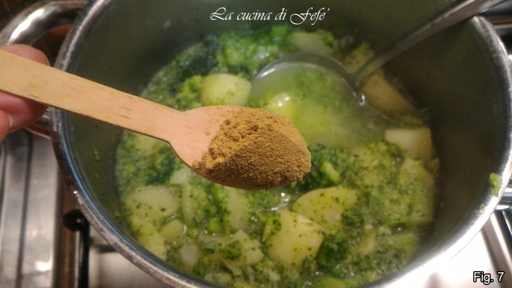 Dek op dit punt de groenten af met de warme bouillon. Breng aan de kook, zet dan het vuur lager en laat, afgedekt met een deksel, ongeveer 25 minuten koken of tot de aardappelen en broccoli zacht lijken (fig. 6).