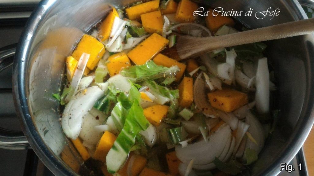 Begin eerst met het maken van een goede groentebouillon door de pompoen in blokjes te snijden, de uien in partjes en de bloemkoolresten in stukjes, breng dan gezouten aan de kook. Kook gedurende 25 minuten of totdat de groenten zacht lijken (fig. 1).