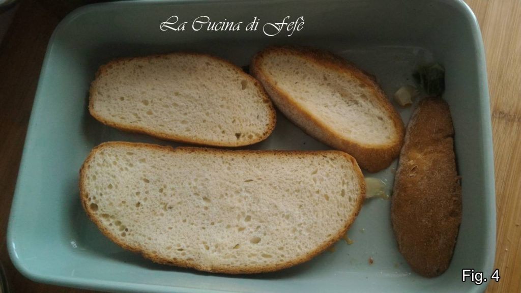 Je bent klaar om je broodtaart te maken. Verspreid twee pollepels hete groentebouillon op de bodem van een ovenschaal, leg dan de eerste laag broodplakken neer, probeer niet te veel ruimte over te laten (fig. 4). Giet nog een paar pollepels bouillon, zonder te overdrijven, omdat het tijdens het koken moet drogen, en bedek met een laag van het geraspte kaasmengsel (fig. 5).