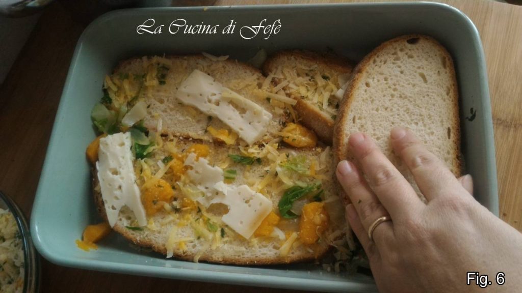 Voeg een paar plakjes asiago toe, gesneden in plakjes (fig. 6) en creëer nog een of twee lagen, herhaal de operatie tot alle ingrediënten op zijn (fig. 7).