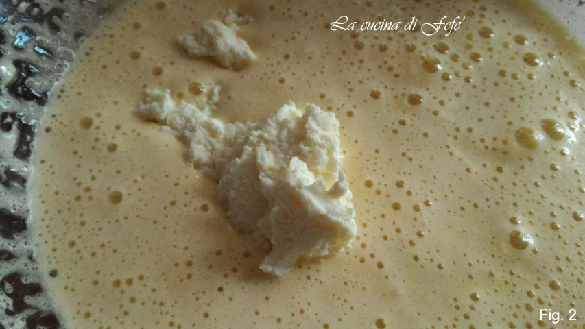 • Als je een luchtig mengsel hebt verkregen, voeg dan de ricotta toe, die eerder door een zeef is gehaald.