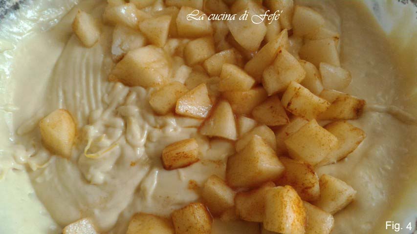 • Begin met het bereiden van je bundtcake door de peer te schillen, schoon te maken en in kleine stukjes te snijden, besprenkel ze vervolgens met citroensap en bestrooi lichtjes met suiker. Klop in een kom met behulp van een elektrische mixer de eieren op kamertemperatuur gedurende 2-3 minuten met de suiker, de kaneel en de geraspte citroenschil.