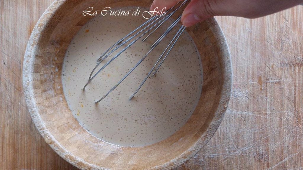 Je moet een glad en homogeen beslag krijgen. Laat het ongeveer 10 minuten afgedekt rusten onder een schone theedoek, zodat het bakpoeder kan activeren.