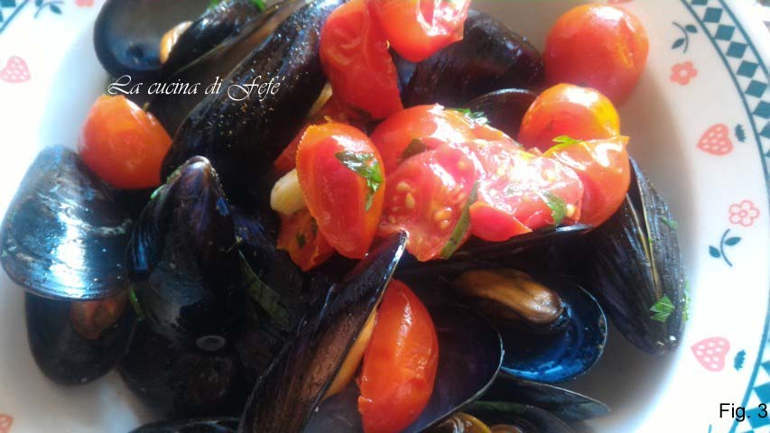 Was ook de venusschelpen onder stromend water en maak ze grondig schoon met een keukensponsje om eventueel zand van de schelp te verwijderen. Intussen, in een antiaanbakpan, laat een teentje knoflook goudbruin worden met extra vierge olijfolie en voeg de mosselen toe. Voeg ook de gehalveerde cherrytomaten toe, dek af met een deksel en laat een paar minuten koken (ongeveer 7′-8′) of totdat de schelpen opengaan (fig. 2).