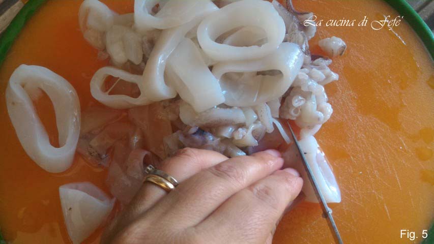 Reinig de inktvissen door voorzichtig de kop en tentakels van de rest van het lichaam te verwijderen, snijd ze in kleine stukjes. Verwijder vervolgens de ingewanden uit de zak en het kraakbeen. Spoel ze af en snijd ze in dunne ringen (fig. 5).