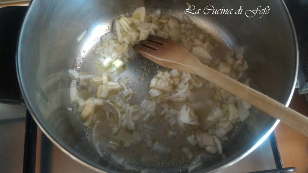 Giet een royale scheut olijfolie in een pan, voeg de sjalotten toe en laat ze 2′ goudbruin worden.