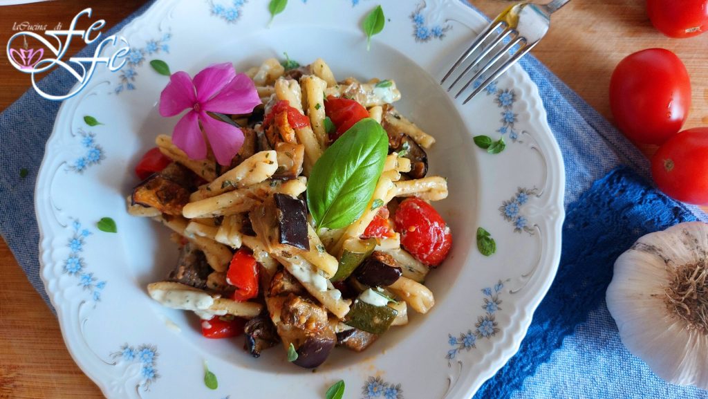 Deze zomer stelt ons echt op de proef door Italië in tweeën te splitsen vanuit meteorologisch oogpunt: in het noorden verschrikkelijke hagelbuien en in het zuiden met een werkelijk ondraaglijke en drukkende hitte! Hier in Sicilië proberen we de hoge temperaturen het hoofd te bieden met frisse en lichte gerechten. Hier op de blog vind je een sectie genaamd Speciale koude salades, een mooie reeks zomerse recepten die zowel gevarieerd als verleidelijk zijn om aan alle smaken tegemoet te komen! Wat ik je vandaag presenteer is net zo goed! Het is een soort pasta die gemakkelijk alle soorten sauzen opneemt, farro caserecce gekruid met de seizoensgroenten die we het meest liefhebben, aubergines, courgettes en cherrytomaatjes, geserveerd met een aromatische en intrigerende roomkaascreme met basilicum die je vanaf de eerste hap zal veroveren! Een explosie van geuren en kleuren die je bij elke gelegenheid op tafel kunt zetten, aan zee, op reis, op kantoor of in de tuin, in een buitenbuffet, en met eenvoud en smaak een gegarandeerd succes kunt behalen!