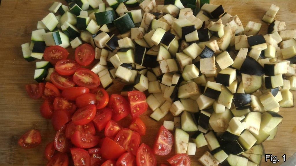 • Na het wassen en schoonmaken van de groenten, snijd de aubergines en courgette in blokjes en de tomaatjes doormidden of in kwarten als ze bijzonder groot zijn (fig. 1).