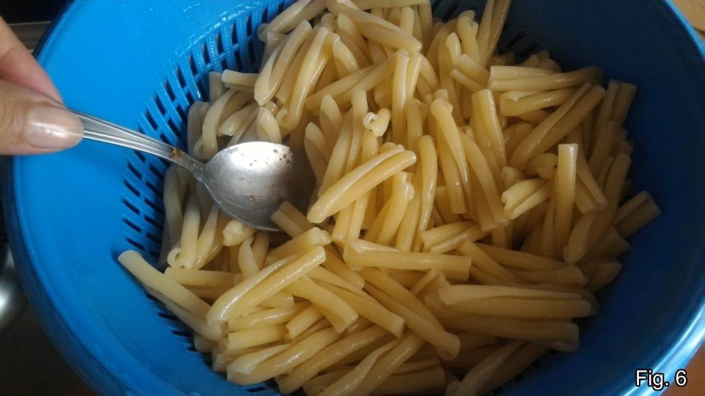 • Verwarm in een voorverwarmde oven op 190°C voor ca. 50′ of tot ze goudbruin zijn, af en toe omdraaien, (fig.4). Haal uit de oven en laat iets afkoelen. Ondertussen, kook de caserecce in een grote pan met gezouten water volgens de instructies op de verpakking (fig. 5).