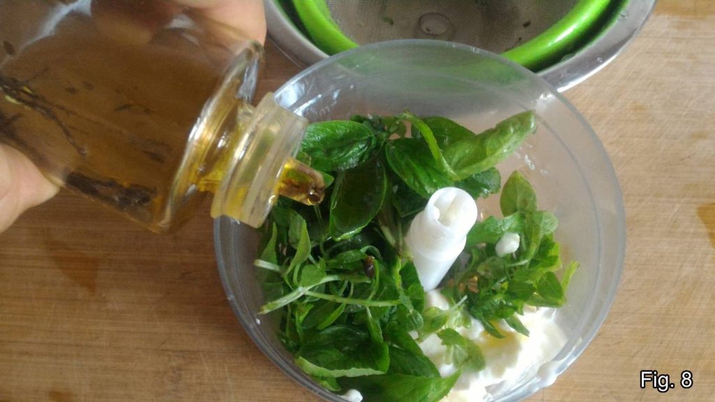 • In een aparte blender, meng de roomkaas, basilicumblaadjes, water, een snufje zout en de olie in een dunne straal (fig. 8). Blend in fasen tot een gladde en homogene vloeibare room is verkregen, voeg indien nodig nog een beetje water toe (fig. 9).