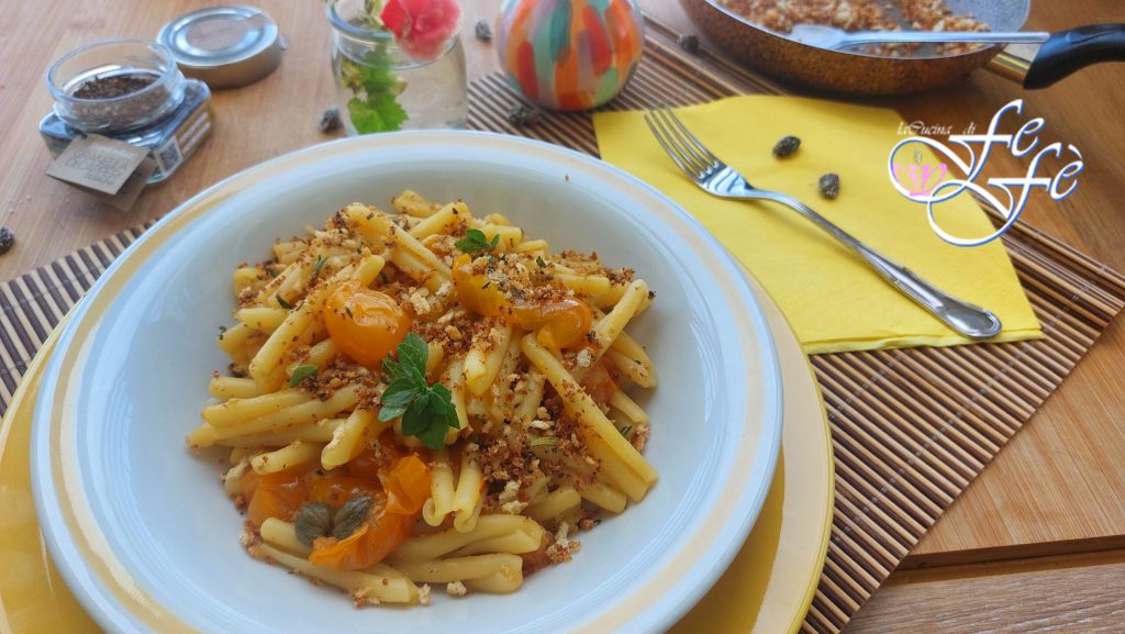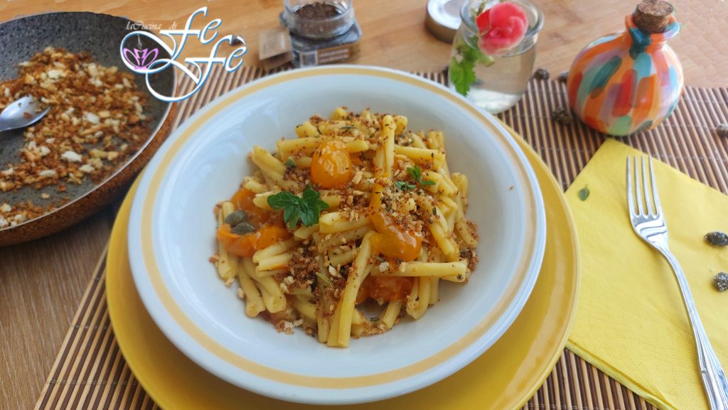 En voilà… uw caserecce met gele datterini met kappertjeskorrels en muddica atturrata is klaar om van te genieten!