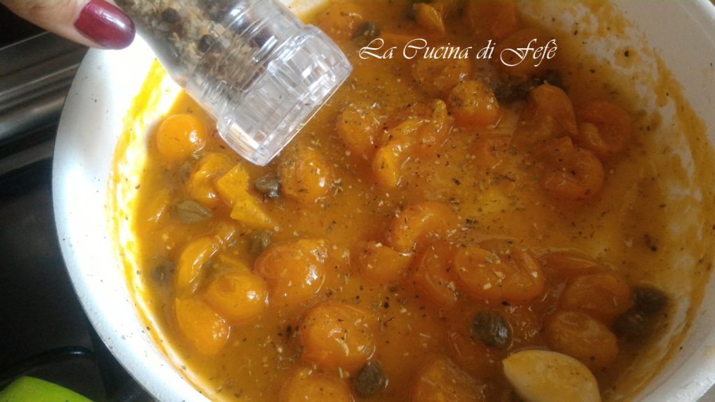 In een tweede grotere pan, bak de knoflook voor een paar minuten goudbruin met een scheutje olie en 2 theelepels kappertjeskorrels, voeg dan de datterini met al hun sap toe en houd het vuur nog een paar minuten hoog.