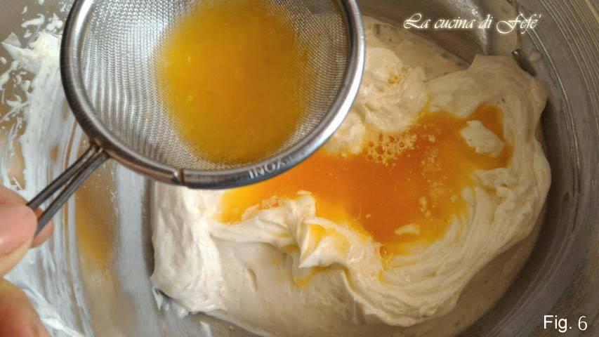 Roer het sinaasappelsap gezeefd door een zeef en blijf kloppen.