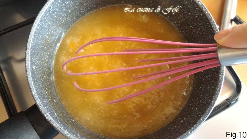 Na deze tijd maak je de topping door in een steelpannetje op laag vuur het water samen met de suiker, het sinaasappelsap en de geraspte sinaasappelschil te verwarmen. Voeg dan het gezeefde maïszetmeel toe en roer totdat de gelei dikker wordt.