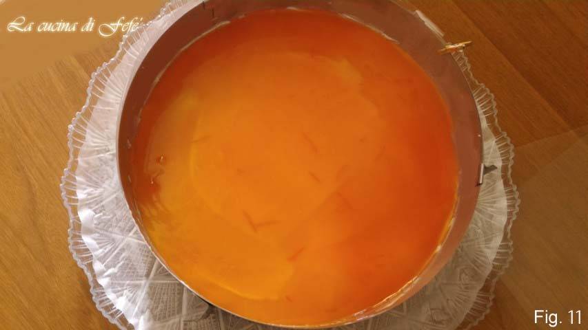 Zet in de koelkast gedurende minimaal 30′ of in de vriezer 15′. Bereid ondertussen de kaascrème voor door de gelatineblaadjes in een kom met zeer koud water te leggen om ze ongeveer 10′ te laten weken.