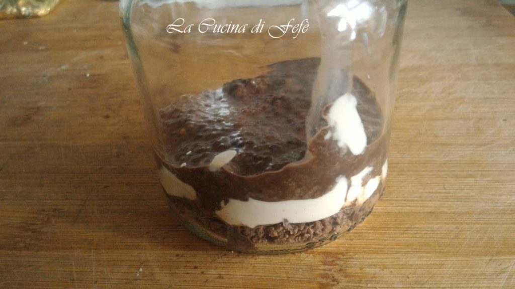 • Je bent klaar om de chia pudding tiramisu naar wens te maken met de ingrediënten uit het recept: in een middelgrote glazen pot verkruimel je grof aan de basis een halve cacao koek.