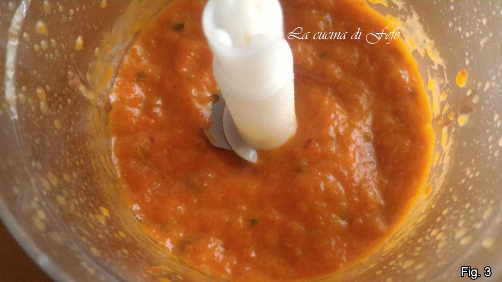 Was de paprika’s, droog ze af met absorberend keukenpapier en leg ze op een bakplaat bekleed met bakpapier. Bak op 200°C gedurende ongeveer 40′, draai ze halverwege de kooktijd. Zet de oven uit, dek ze af met hun eigen papier en laat ze 20′ rusten, pel ze vervolgens en verwijder de steel en de binnenste zaden. Doe de gereinigde pulp in reepjes in een mixer.