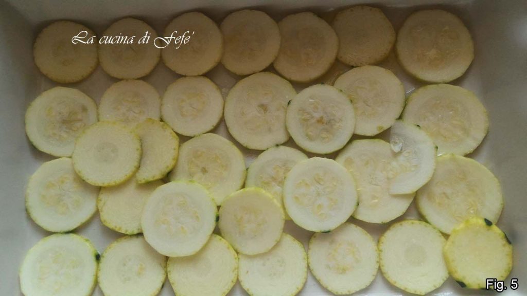 Begin de parmigiana te bouwen door een scheutje olie op de bodem van een ovenschaal te gieten en 2 eetlepels water toe te voegen om de juiste vochtigheid te creëren. Maak de eerste laag courgettes.