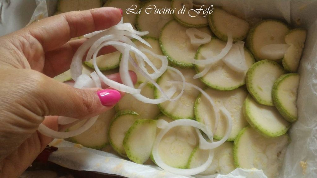 • Bekleed een ovenschaal met een vel bakpapier en bestrijk het met 2 eetlepels olie. Leg een eerste laag courgetteplakjes en een van ui zonder ze te veel te overlappen.