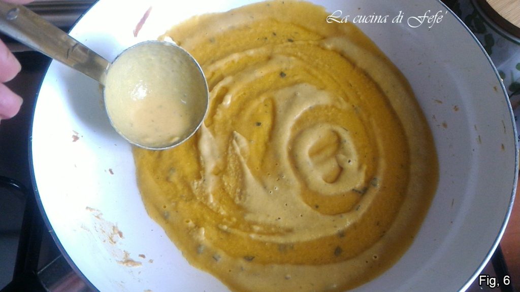 Voeg de olie toe en giet de melk er langzaam bij terwijl je blijft roeren eerst met de houten lepel en daarna met een handgarde (fig. 4).