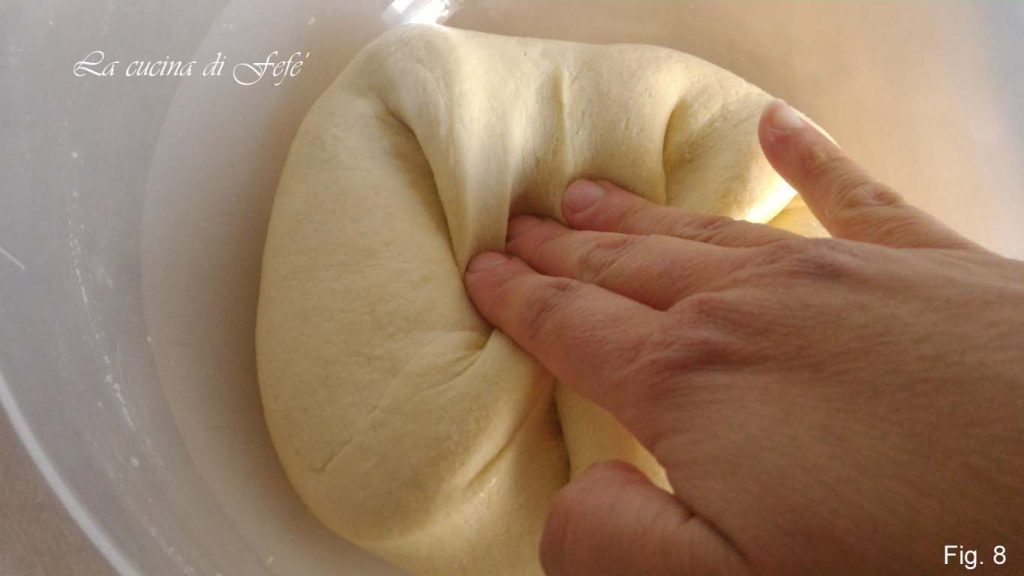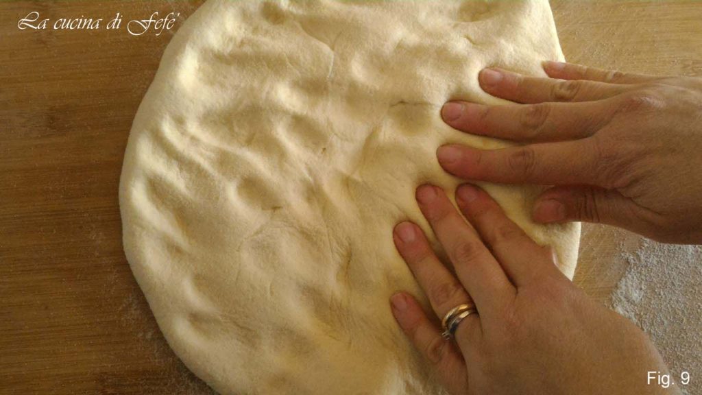 Vorm een bol door het deeg rond te maken en leg het op een bakplaat bedekt met licht bebloemd bakpapier. Bestuif ook het midden van het deeg lichtjes en maak een gat in het midden door het met je handen uit te rekken en zorg ervoor dat het niet scheurt (fig. 13).
