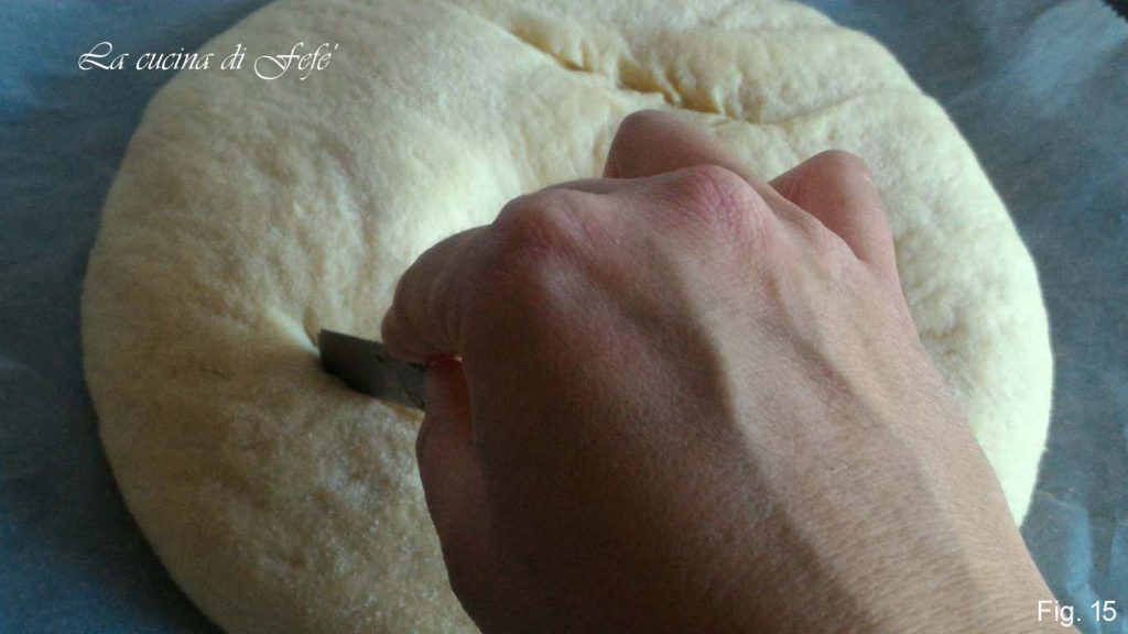 Laat het in een uitgeschakelde oven met het licht aan ongeveer 2/3 uur rijzen. Maak dan sneden in het oppervlak met een scherp mes of een scherp precisie mes voor brood (fig. 14).
