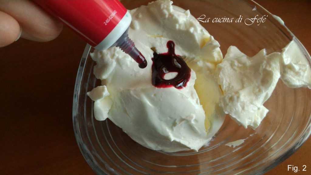 Voeg in een kom de voedingskleurstof toe aan de mascarpone en meng goed.