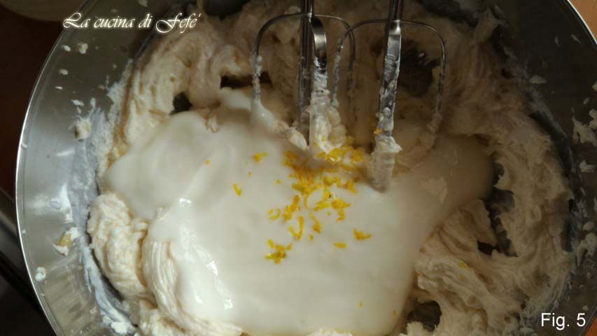 Voeg vervolgens de yoghurt en de geraspte schil van 1 ongebruikte citroen toe en blijf kloppen met de mixer.