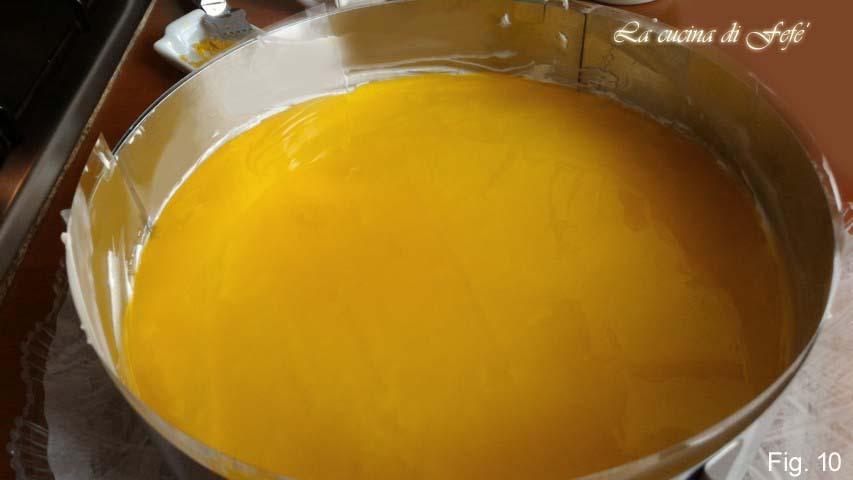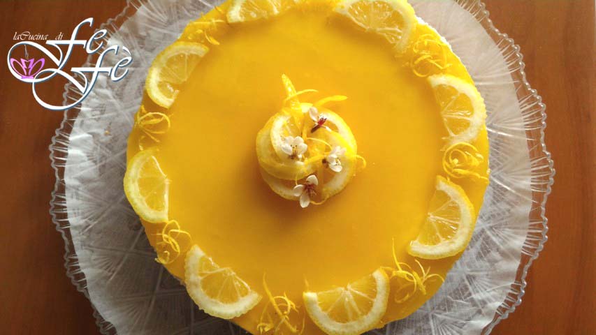 Zet de cheesecake weer in de koelkast voor 2 uur. Na deze tijd bereid je de citroentopping door in een steelpan op laag vuur het water met de suiker, het citroensap en de geraspte schil te laten smelten. Zodra de suiker is opgelost, voeg je de gezeefde maïszetmeel toe en meng totdat de gelatine dik is geworden. Zet het vuur uit en voeg een beetje gele voedingskleurstof toe. Laat afkoelen. Giet vervolgens de gelatine over de cheesecake en egaliseer deze.