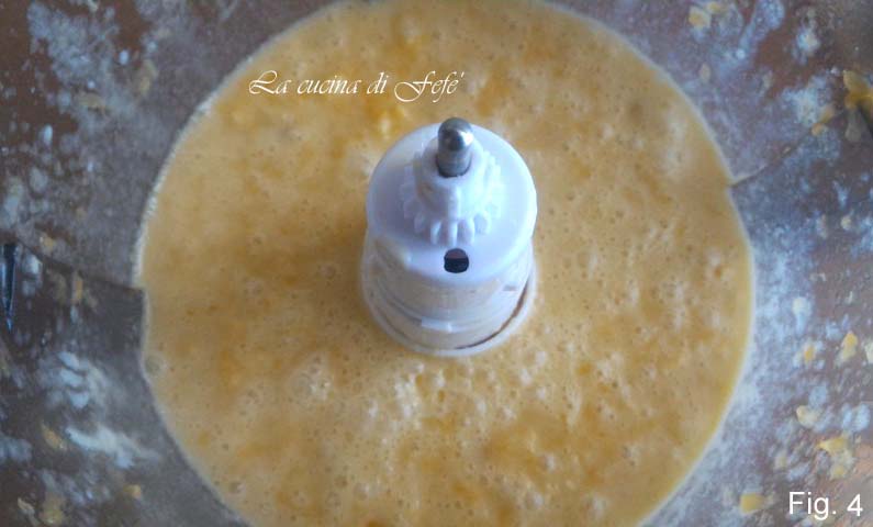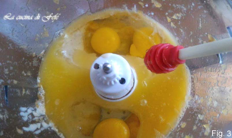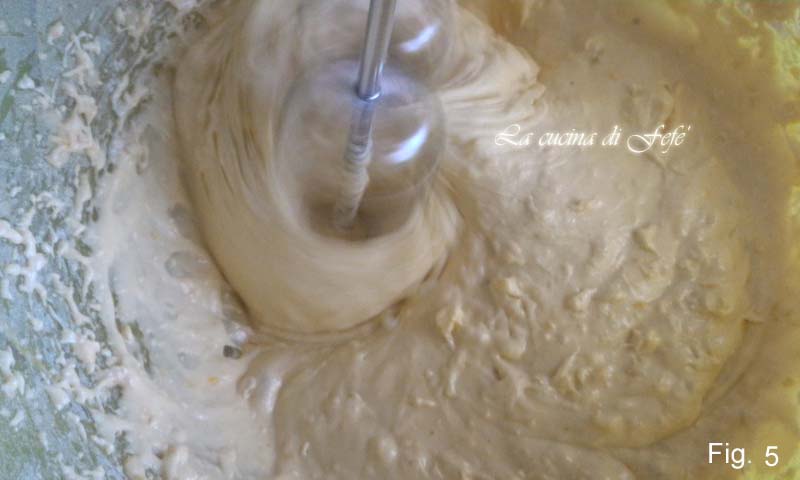 Giet het verkregen mengsel in een grote kom en begin met behulp van de elektrische garde te kloppen, waarbij je beetje bij beetje de suiker, de gezeefde bloem en bakpoeder en een snufje zout toevoegt.