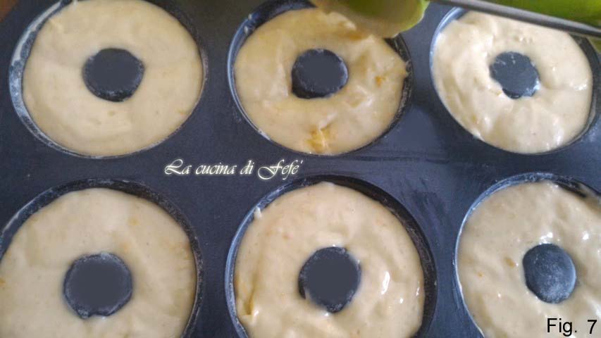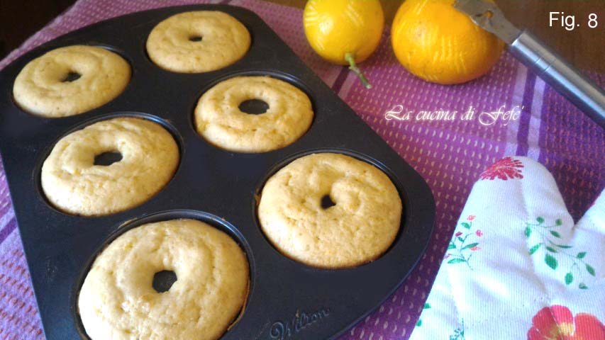 Bakken gedurende ongeveer 15′, zorg ervoor dat de tijd niet langer wordt verlengd, zodat de donuts niet droog en hard worden. Doe toch de satéprikker-test voordat je de oven uitzet. Haal ze uit de oven en laat ze op kamertemperatuur afkoelen voordat je ze uit de vorm haalt.