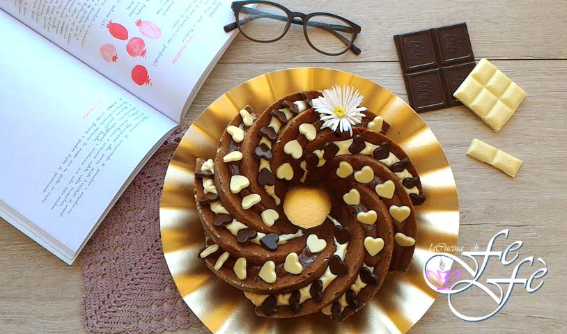Goedemorgen vrienden! Deze cake die ik jullie vandaag voorstel, is gemaakt om de verjaardag van mijn schoonzus te vieren! Ik wilde haar verrassen, maar had alleen het idee om iets te maken met witte en pure chocolade, maar toen ik op internet zocht, vond ik niets dat mijn idee benaderde of voldeed aan mijn eisen om het niet te overdrijven met eieren of te vette ingrediënten zoals mascarpone en ricotta. Kortom, lekker maar altijd met een oog op de gezondheid, dus besloot ik een smakelijke en chocoladerijke cake te maken met mijn eigen doseringen, die altijd verbeterd kan worden, maar ik moet zeggen dat het voor een eerste poging helemaal niet slecht was, integendeel! Het was bijna in één avond verdwenen! Dankzij mijn fantastische en onmisbare vorm van Nordic Ware, kon ik het op sublieme wijze glazuren dankzij de groeven die ontstaan wanneer de cake uit de vorm komt! Jullie kunnen echter ook kiezen voor een eenvoudige vorm en de twee ganaches van boven laten lopen zoals je het liefst wilt! Het resultaat zal hoe dan ook geweldig zijn! Wat betreft de hartvormige decoraties, wil ik duidelijk maken dat ik ze met de hand heb gemaakt met de restjes van de glazuren, maar ook hier kunnen jullie het jezelf gemakkelijk maken door ze kant-en-klaar te kopen in gespecialiseerde winkels. In dat geval, verklein de hoeveelheden een beetje en smakelijk tussendoortje voor iedereen!