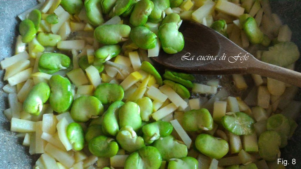 • Voeg ook de verse tuinbonen toe, zet het vuur laag en kook verder voor 5′.