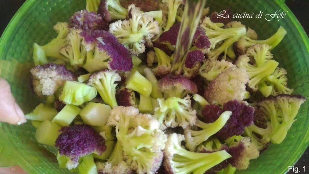 Maak de bloemkool schoon, snijd in middelgrote roosjes en was ze onder stromend water (fig. 1).