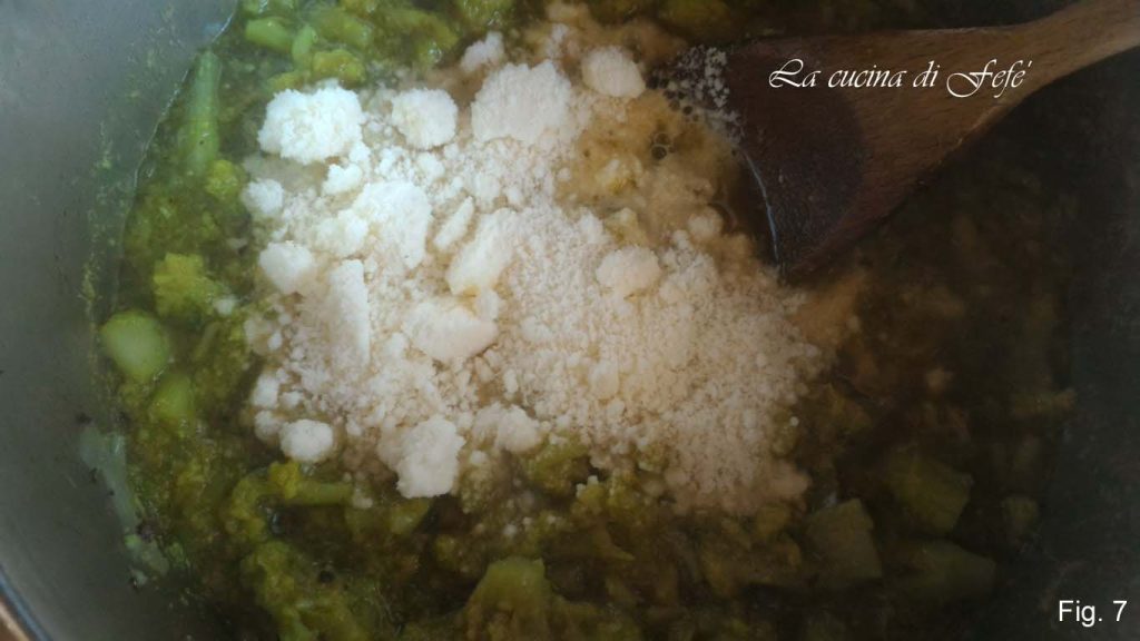 Roer met een houten lepel, voeg dan ook de geraspte pecorino toe en meng goed (fig. 7).