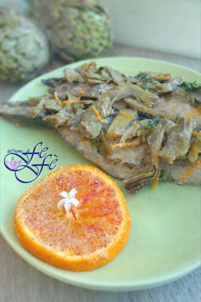 Bedek de filets met de gestoofde artisjokken en een paar schijfjes sinaasappel. Besprenkel met een scheutje olie en het sap van een halve sinaasappel en zet 25 minuten in een statische oven op 180°C.