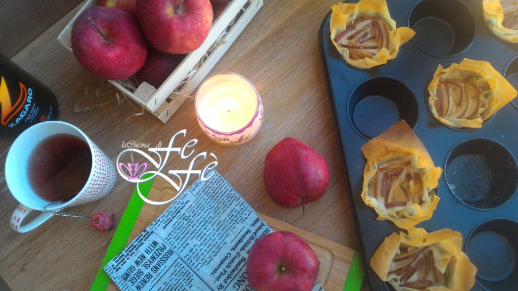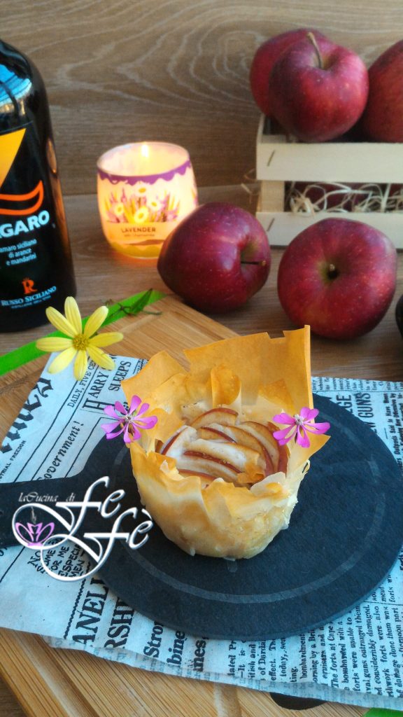 Een paar weken geleden had ik het geluk om een ​​krat super biologische appels cadeau te krijgen, geproduceerd door een jong en klein landbouwbedrijf in het binnenland van Sicilië, aan de voet van de Etna. De eigenschap van het bedrijf is gebaseerd op de integratie van biologische gewassen op bergachtige hoogtes die doorgaans vijandig zijn in vergelijking met zeeniveau. Hoewel het onlangs is opgericht, heeft het als doel inheemse producten van de Etna te bevorderen en tegelijkertijd, door herontdekking van de natuur, nieuwe uitdagingen aan te gaan door middel van nieuwe teelten van fruit en groenten. Je weet hoezeer ik alles wat natuurlijk is waardeer, en geloof me, het is van onschatbare waarde om zonder zorgen ook de schil van een vrucht te kunnen gebruiken! Want appels behoren tot het meest geconsumeerde fruit ter wereld, en we weten maar al te goed hoeveel voedingsstoffen er in hun schil zitten. Aangezien er echter veel pesticiden en gewasbeschermingsmiddelen op worden gebruikt, kun je alleen van deze eigenschappen profiteren als je zeker bent van hun herkomst of als ze biologisch gecertificeerd zijn. Je kunt je mijn vreugde voorstellen toen ik ze kreeg, en de geur die ze verspreidden was intens, natuurlijk en zoet, totaal anders dan die je ergens anders koopt! Met mijn mooie voorraad heb ik meteen marmelade gemaakt om te gebruiken bij het ontbijt of als vulling voor een taart om van te genieten bij een snack! Met de schillen heb ik geweldige infusies gemaakt en tenslotte deze echt speciale filodeeg mandjes! Het zijn kleine desserts met lepels, gevuld met melkroom en schijfjes appel in een infusie met likeur en kaneel! Krokant aan de buitenkant en met een zachte en aromatische kern aan de binnenkant! Hemels! Mijn man heeft ze letterlijk verslonden en ik moet zeggen dat ze perfect geschikt zijn als perfecte dessert na de maaltijd, spectaculair en smakelijk zonder te veel calorieën! Ze bereiden is uiterst eenvoudig, dus zelfs bij onverwachte gasten kun je hen op een originele en verrassende manier in een paar simpele stappen verrassen!