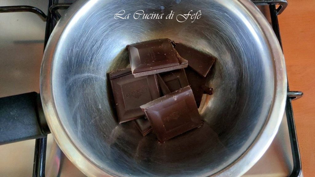 • Ondertussen, breek de chocolade in gelijke stukken, vul een steelpan met heet water en plaats er een kleinere kom bovenop met de chocolade erin.
