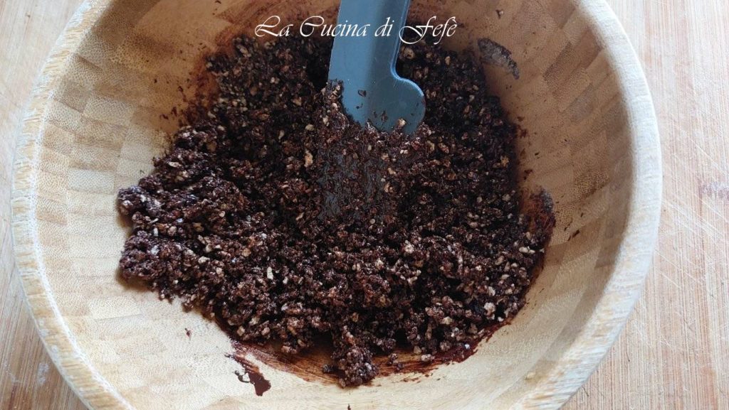 • Bekleed de bodem van een springvorm met een diameter van 20 Ø met bakpapier en vet de randen in. Verdeel dan het mengsel van granen en chocolade over de bodem, druk het aan met een glas en probeer het gelijkmatig te verdelen voor dezelfde dikte over de hele diameter. Zet 30′ in de koelkast.