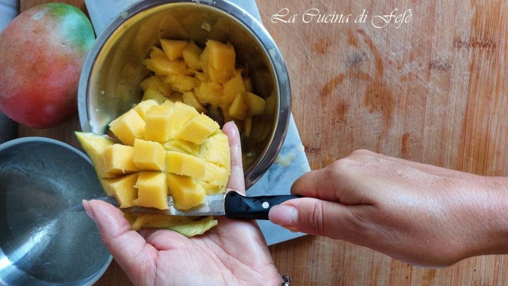 • Was ondertussen de mango en snijd deze in steekvorm zonder eerst te schillen. Zodra je de twee helften zonder pit hebt verkregen, maak je kruiselings diagonale sneden, zonder de schil te raken.