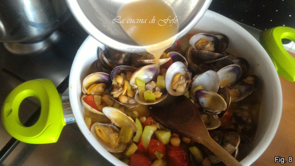 Doe de venusschelpen en groenten in een kom, zeef het kookvocht dat je apart houdt. Doe alles terug in de pan, voeg de kikkererwten toe en breng op smaak met zout en peper (fig. 7).