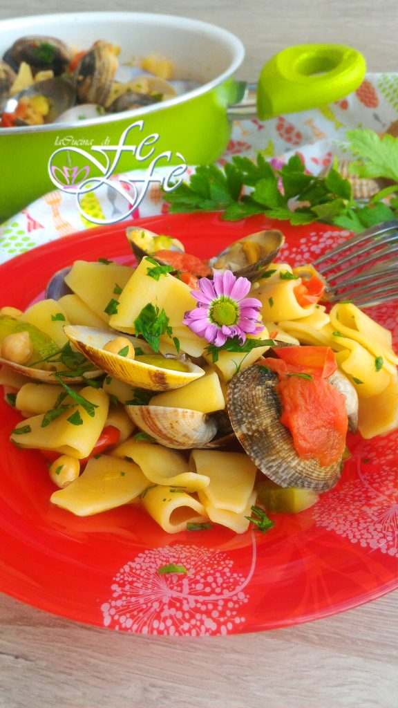 Gisteren 25 oktober was het World Pasta Day, de wereldwijde dag van de pasta, nu al de 23e editie! Een dag die een van de meest verspreide en geconsumeerde gerechten ter wereld viert! Ja, ik weet het, ik ben te laat! Ik probeer het, maar het juiste moment voor bepaalde gelegenheden past echt niet bij mij! Toch wil ik graag hulde brengen op mijn eigen kleine manier, door mezelf een pastaliefhebber bij uitstek te noemen! En dat doe ik graag met dit heerlijke recept met zeelucht! Het is een voorgerecht waarbij het type pasta echt het verschil maakt, omdat de fork pasta met bronzen matrijzen getrokken is, wat een stevigheid en ruwheid geeft die elke smaak versterkt! Uiteraard kun je variëren met andere formaten, zoals paccheri of calamarata. Ze zijn allemaal perfect om smaakvolle maar lichte sauzen op te nemen en te vergezellen zoals die ik je vandaag aanbied! Een perfecte combinatie tussen zee- en tuingewassen! Een combinatie van venusschelpen, courgettes, cherrytomaten en de laatste touch van kikkererwten, die een voedingswaarde aan het geheel bieden! En sorry als dat niet weinig is!