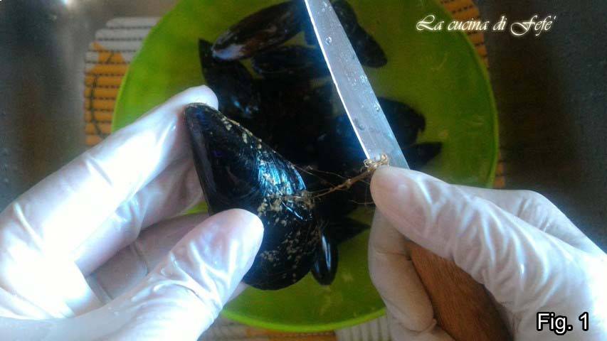 Verwarm in een antikleefpan een knoflookteen met wat extra vergine olijfolie, enkele takjes peterselie, de rode peper en een scheut water, voeg dan de mosselen toe.