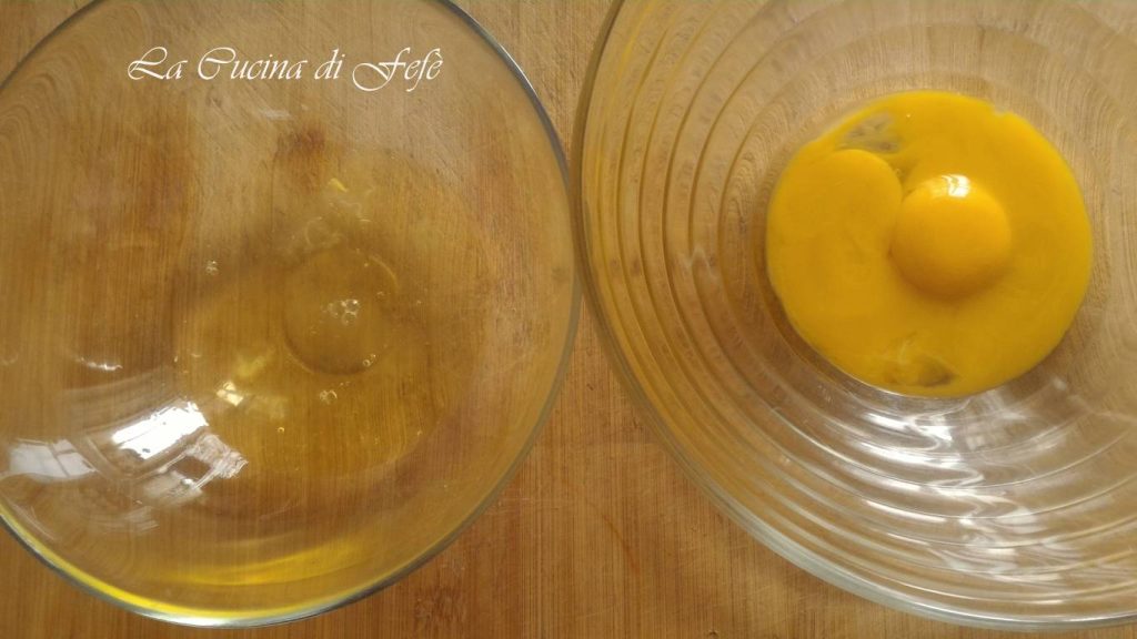 Om te beginnen, scheid de eidooiers van de eiwitten en plaats ze in twee aparte kommen.