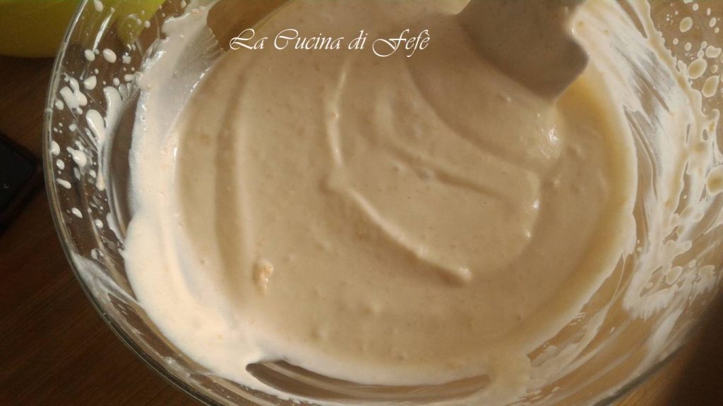 Voeg de yoghurtroom toe aan het geslagen eiwit met behulp van een spatel met langzame bewegingen van onder naar boven om het mengsel niet te laten zakken.