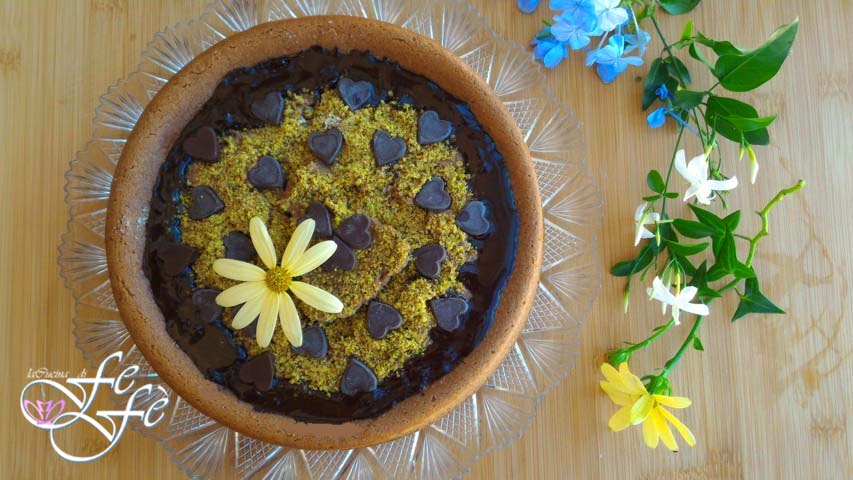 • Na het bakken de oven uitschakelen, de oven gesloten houden voor nog eens 15-20′, vervolgens de cheesecake uit de oven halen en volledig laten afkoelen. Open de taartvorm, plaats de taart op een mooi bord en decoreer met veel pistachemeel, chocoladetopping langs de randen en chocoladehartjes die ik gemaakt heb met behulp van vormpjes.